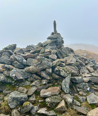 I had entered the clouds at about 500 metres and stopped to put on a jacket. I was hoping the clouds would disperse and they did for a fleeting few seconds just after I reached the beautifully constructed trig point that sits erect on a rocky plinth. I ate an orange and drank some water hoping that the clouds would break but no luck today, it was retribution for all the sun-kissed days of September.